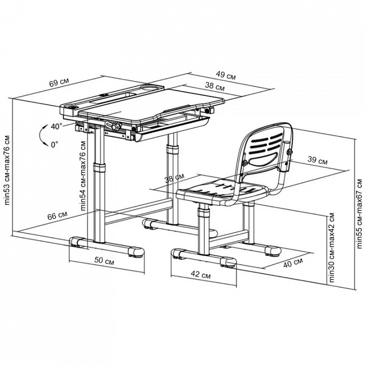 cтол учебный - 690x490x530-760 мм стул - 400x420x550-670 мм |